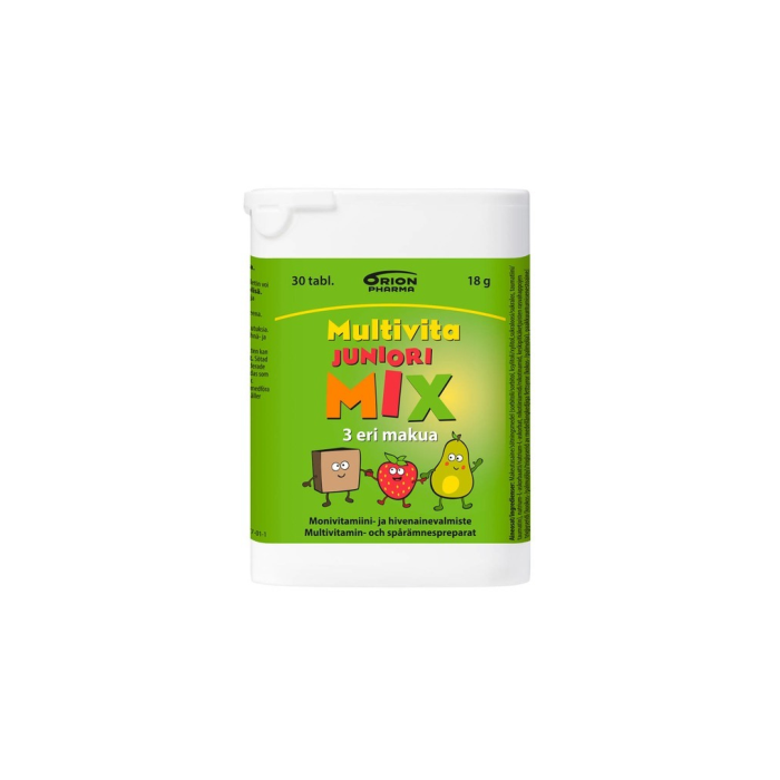 Multivita Juniori MIX on monipuolinen ja hyvänmakuinen, pureskeltava monivitamiinitabletti perheen pienimmille. Hauska monimakupakkaus - samassa pakkauksessa on toffeen,-mansikan ja päärynän makuisia -ja värisiä tabletteja. Niistä voi valita joka päivälle mieleisensä maun! Yksi pienikokoinen, helposti suussa hajoava tabletti sisältää 14 päivittäin tarvittavaa vitamiinia ja kivennäisainetta. Laktoositon (maidoton), hiivaton, gluteeniton, sokeriton. Ei sisällä soijaa eikä liivatetta.