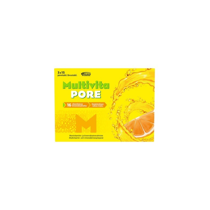Hedelmäisen appelsiininmakuinen monivitamiini raikkaana porejuomana on hyvä vaihtoehto nieltävälle monivitamiinitabletille. Multivita Pore vastaa vitamiini - ja hivenainekoostumukseltaan Multivita-monitamiinitablettia. Vähäkalorinen -ja suolainen (1 poretabletti sisältää 7,1 Kcal ja 163 mg natriumia). Laktoositon, gluteeniton, hiivaton, sokeriton. Makeutettu aspartaamilla ja asesulfaami K:lla. Ravintolisä.